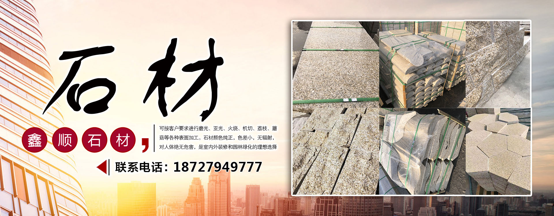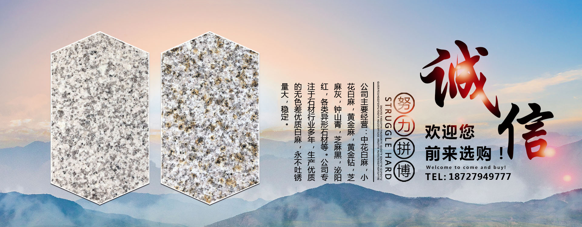 隨州市鑫順石材有限公司位于湖北省隨州市隨縣萬(wàn)和鎮(zhèn)桐柏山。是一家集礦山開(kāi)采、石材加工、異形制作、產(chǎn)品銷售為一體的大型綜合型石材企業(yè)!本公司主要經(jīng)營(yíng):中花白麻,小花白麻,黃金麻,黃金鉆,芝麻灰,鐘山青,芝麻黑,泌陽(yáng)紅,各類異形石材。生產(chǎn)的石材規(guī)格齊全、做工精細(xì),被廣泛用于外墻干掛、廣場(chǎng)地鋪、市政園林、建筑工程、環(huán)境景觀異形石材等各類建筑墻體、地面的裝飾裝修。公司專注于石材行業(yè)多年,生產(chǎn)優(yōu)質(zhì)的無(wú)色差優(yōu)質(zhì)白麻,永不吐銹量大,穩(wěn)定,主攻高鐵站,地鐵站,機(jī)場(chǎng)等大型市政房產(chǎn)。可承接各種異形加工,速度快,質(zhì)量無(wú)憂。我們秉承“誠(chéng)信經(jīng)營(yíng),服務(wù)為本”的經(jīng)營(yíng)理念,竭誠(chéng)為廣大客戶提供優(yōu)質(zhì)的產(chǎn)品和滿意服務(wù),期待與您的合作,竭誠(chéng)歡迎國(guó)內(nèi)外新老客戶前來(lái)訂購(gòu)洽談!
